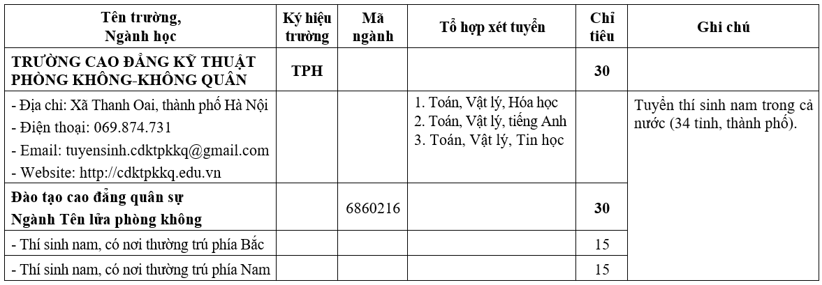 Phương thức tuyển sinh, đối tượng tuyển sinh, hồ sơ đăng ký xét tuyển cho đối tượng Cao đẳng năm 2026 của Trường Cao đẳng Kỹ thuật Phòng không - Không quân.